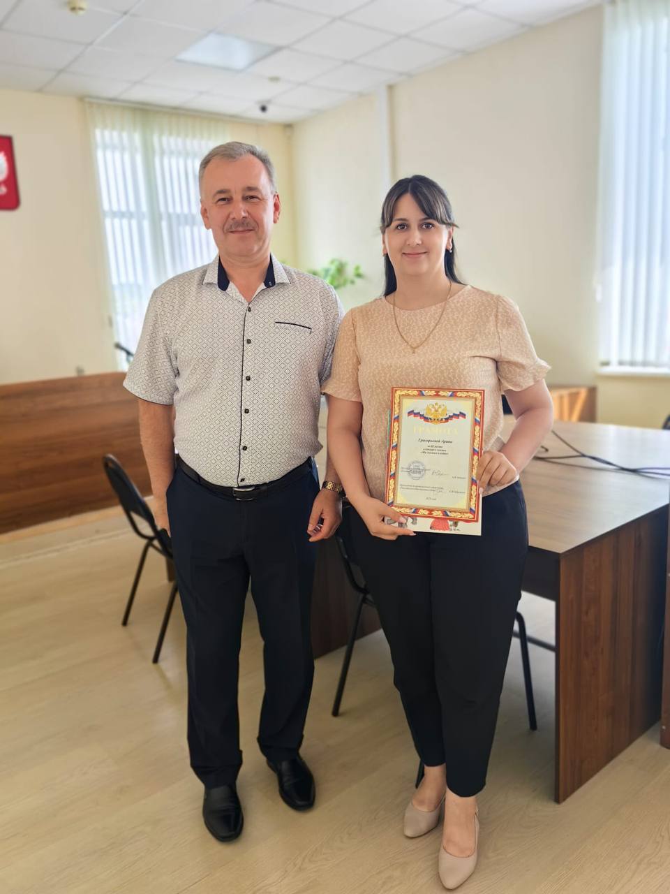 Председатель Опочецкого районного суда Вячеслав Алексеевич Ефимов вручил подарки и грамоту Совета судей Псковской области помощнику судьи Григорьевой А.В., чья дочь Григорьева Арина приняла участие в конкурсе чтецов «Мы помним о войне» посвященном 80-й годовщине Победы в Великой Отечественной войне. ![]() |